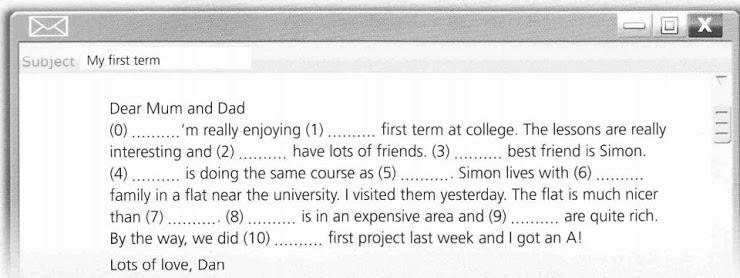 I'm really enjoying my first term at college. The lessons are really interesting and I have lots of friends. My best friend is Simon. He is doing the same course as me. Simon lives with his family in a flat near the university. I visited them yesterday. The flat is much nicer than mine. It is in an expensive area and Simon's parents are quite rich. By the way, we did our first project last week and I got an A!