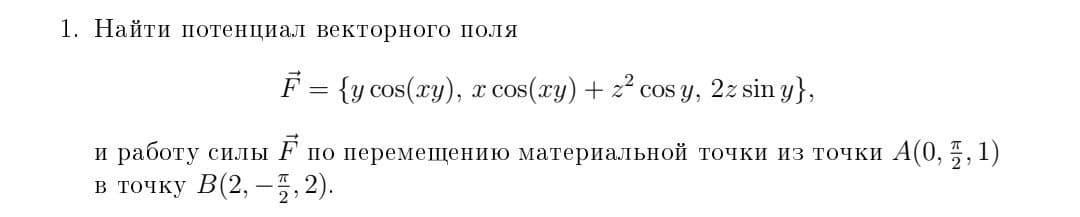 говорит о том, что в потенциал в качестве слагаемого входит sin(xy). Вторая координата поля F это подтверждает. Далее, второе слагаемое второй координаты и третья координата поля F говорят о наличии в потенциале слагаемого z²sin y.