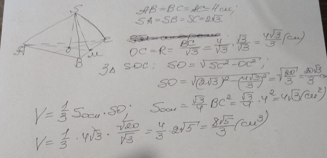 Сторона основания правильной треугольной пирамиды равна 4 см, а её боковое ребро 2√3см. Вычислите объём пирамиды.