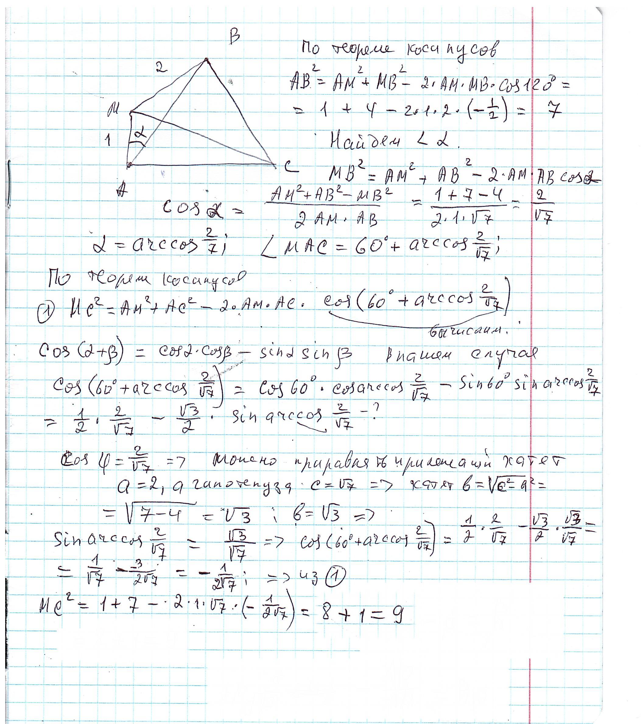 Вне равностороннего треугольника ABC выбрали такую точку M, что ∠AMB=120∘, MA=1, MB=2. Найдите квадрат длины отрезка MC.