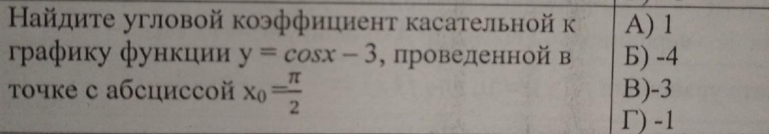 Дана функция y = cosx - 3. Для того, чтобы найти угловой коэффициент касательной (или численно ей равный тангенс угла наклона касательной), проведенной к графику функции в точке х₀, необходимо найти производную данной функции в этой точке: