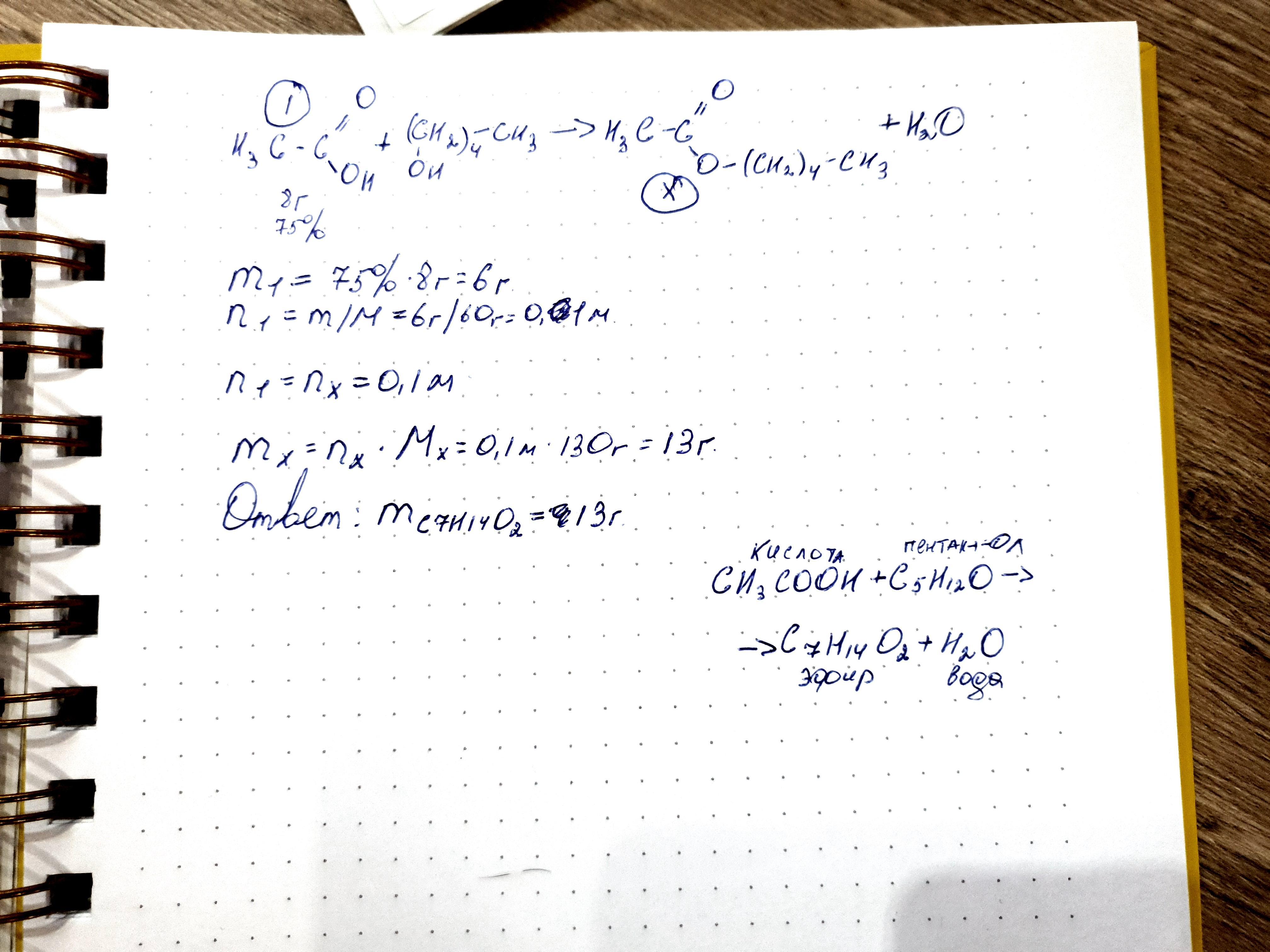 Обчислити масу естеру, що можна одержати з етанової кислоти масою 8г.,з масовою часткою домішок 25%, під час взаємодії з пентан-1- олом.
