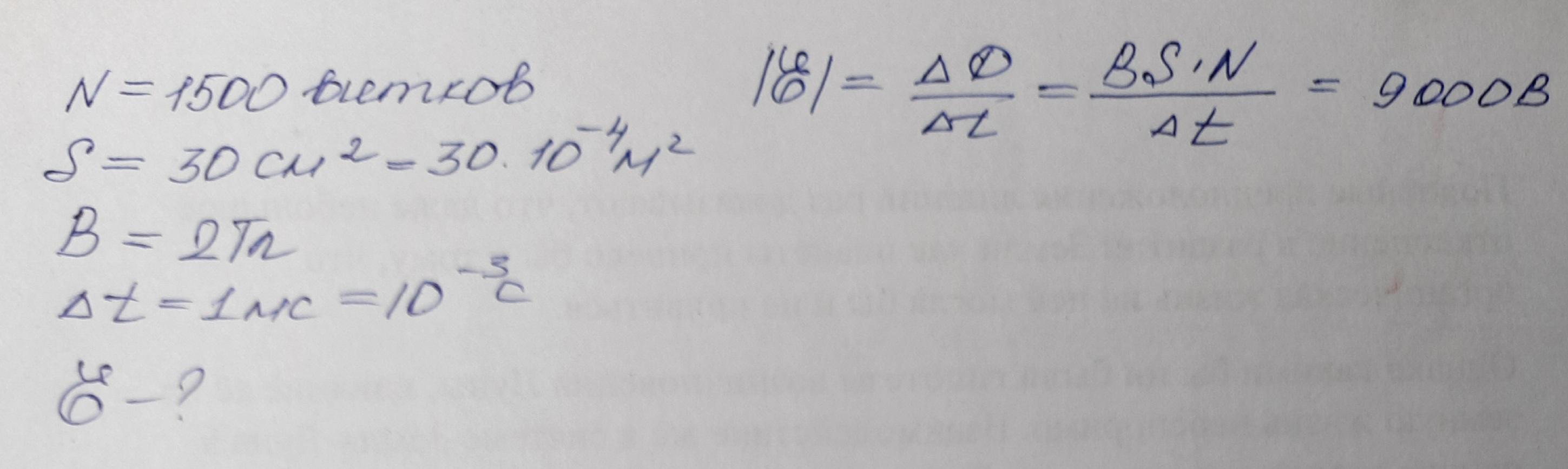 16.Определите среднюю величину ЭДС индукции, возникающую при выключении тока в электромагните, обмотка которого содержит 1500витков. Площадь поперечного сечения сердечника 30 см2, индукция поля магнита 2 Тл, время уменьшения тока до нуля равно 1 мс.