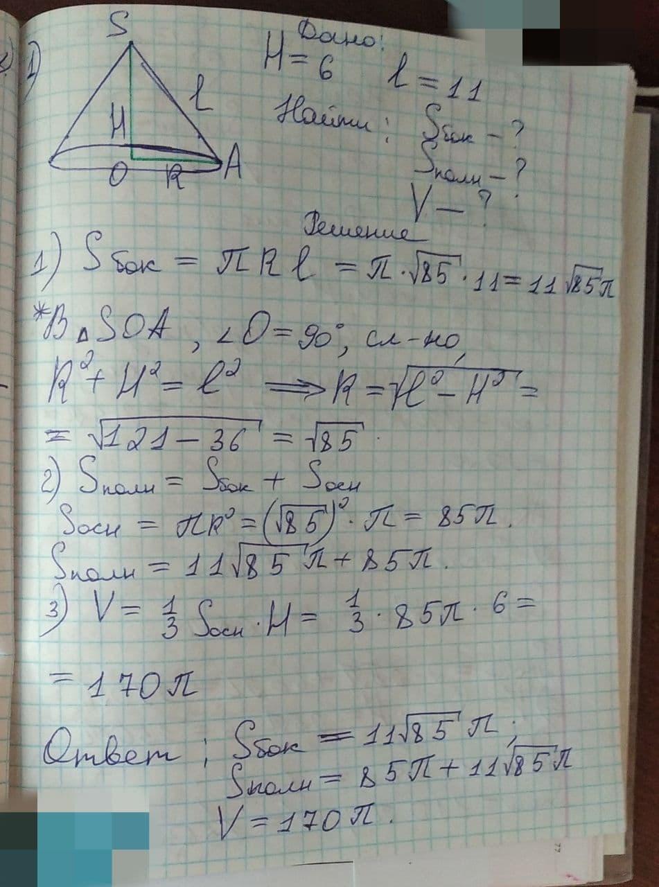 1) Вычислите площадь боковой поверхности, площадь полной поверхности и объем конуса, если высота равна 6см, образующая 11см.