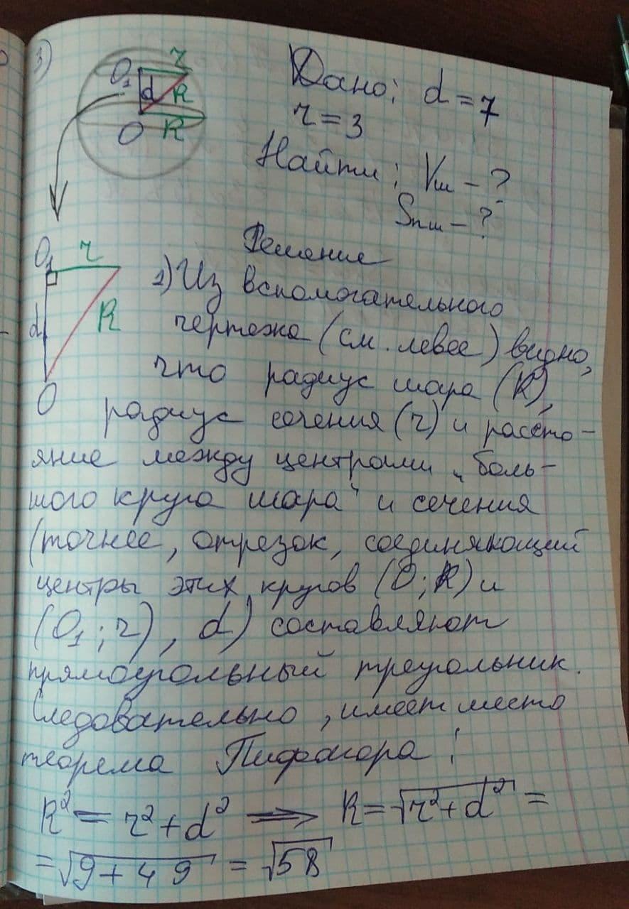 3) Вычислите объём шара и площадь его поверхности, если радиус его сечения, проходящего на расстоянии 7см от центра, равен 3 см.