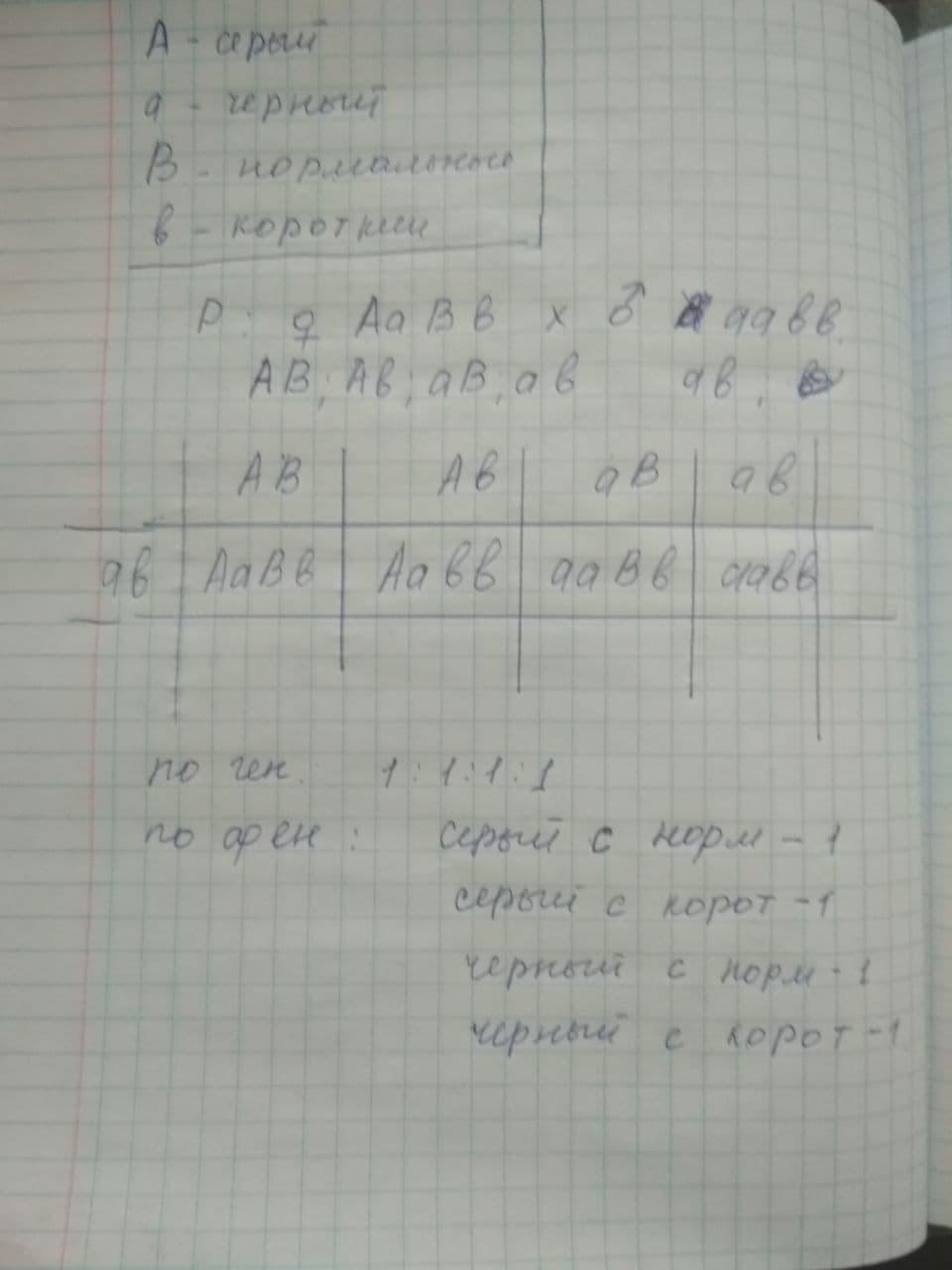 у мухи дрозофилы ген серого цвета тела (А) доминирует над геном черного цвета (а), а ген нормальной длины крыльев (В)-над геном коротких крыльев (в). Гены сцеплены. скрестили муху сервис нормальными крыльями (дигетерозиготы) с рецессивной гомозиготой по этим же признакам- черной с короткими кольями.