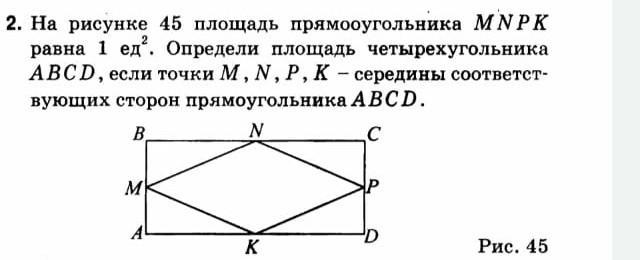 Прямоугольник MNPK состоит из четырех равных треугольников ⇒ площадь одного треугольника SΔ= 1/4