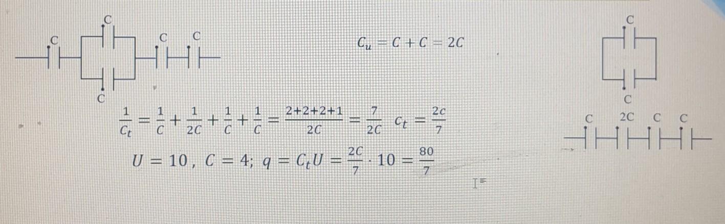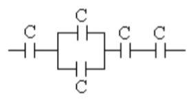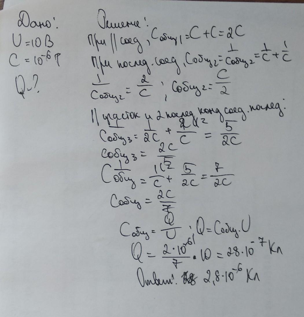 Найти заряд в системе конденсаторов, если напряжение U = 10 В, а все ёмкости конденсаторов одинаковы С = 10-6 Ф.