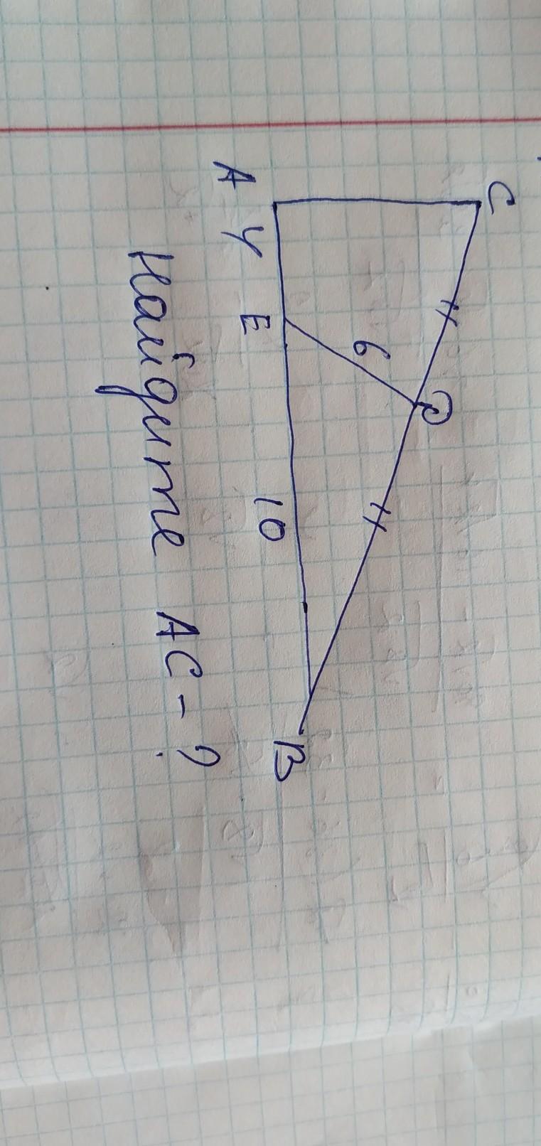 Самый примитивный способ - теорема косинусов для треугольника EDB, где DB = х. Тогда х^2 + 10^2 - 2x*10*14/2x = 36, откуда х = 2 корня из 19. Тогда квадрат гипотенузы ВС равен 16*19 = 304, а искомый отрезок АС (по теореме Пифагора) 6 корней из 3.