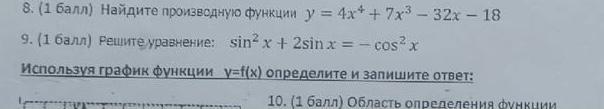 8)y=4x^{4} +7x^{3} -32x-18\\\\y'=4\cdot(x^{4})'+7\cdot(x^{3})'-32\cdot x' -18'=4\cdot4x^{3} +7\cdot 3x^{2}-32\cdot 1-0=\\\\=\boxed{16x^{3}+21x^{2}-32} \\\\\\9)Sin^{2}x+2Sinx=-Cos^{2}x \\\\Sin^{2}x+2Sinx+Cos^{2}x =0\\\\Sin^{2}x+2Sinx+1-Sin^{2}x =0\\\\2Sinx+1=0\\\\2Sinx=-1\\\\Sinx=-\dfrac{1}{2}\\\\x=(-1)^{n} arcSin(-\dfrac{1}{2})+\pi n,n\in Z\\\\\boxed{x=(-1)^{n+1}\frac{\pi }{6}+\pi n,n\in Z }