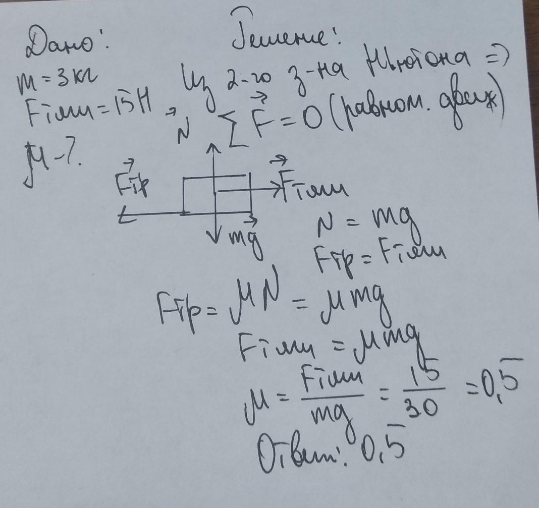 СРОЧНО! Найти коэффициент трения при равномерном движении тела массой 3 кг под действием силы тяги 15 Н.