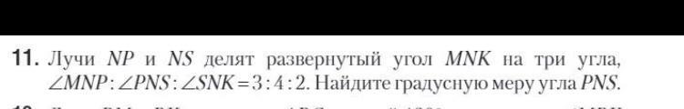 ∠MNP :∠MNS: ∠SNK=3x:4x:2x и также мы знаем что развернутый угол равен 180 тогда сумма углов ∠MNP +∠MNS+∠SNK=180 => Ответ : ∠ PNS=80°
