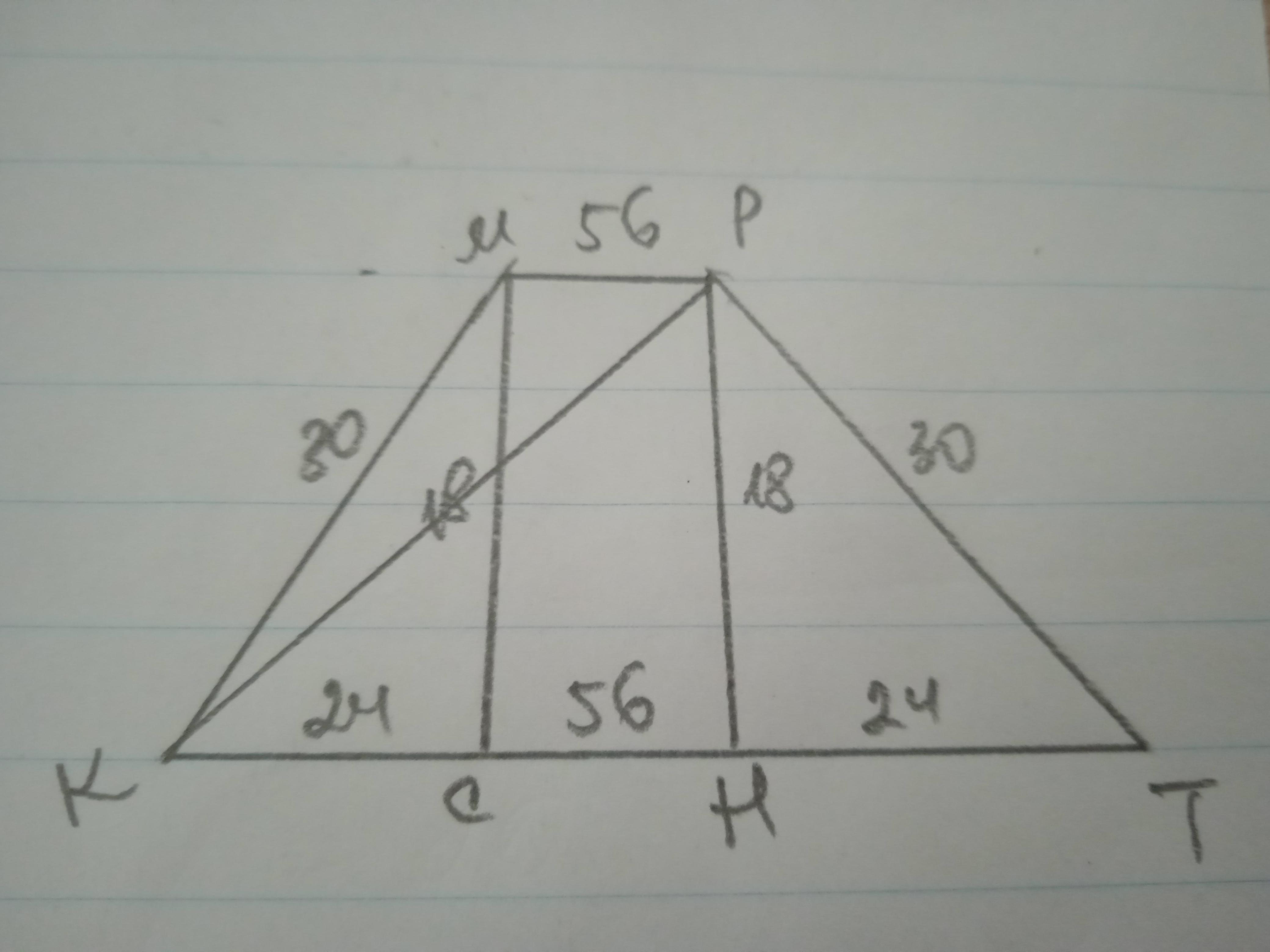 Дано: КМРТ - трапеция, КМ=РТ=30; МР=56; КТ=104. Найти КР.