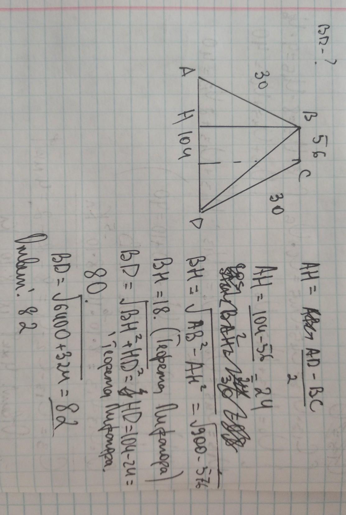 Решите задачу. Основания равнобедренной трапеции равны 56 и 104, боковая