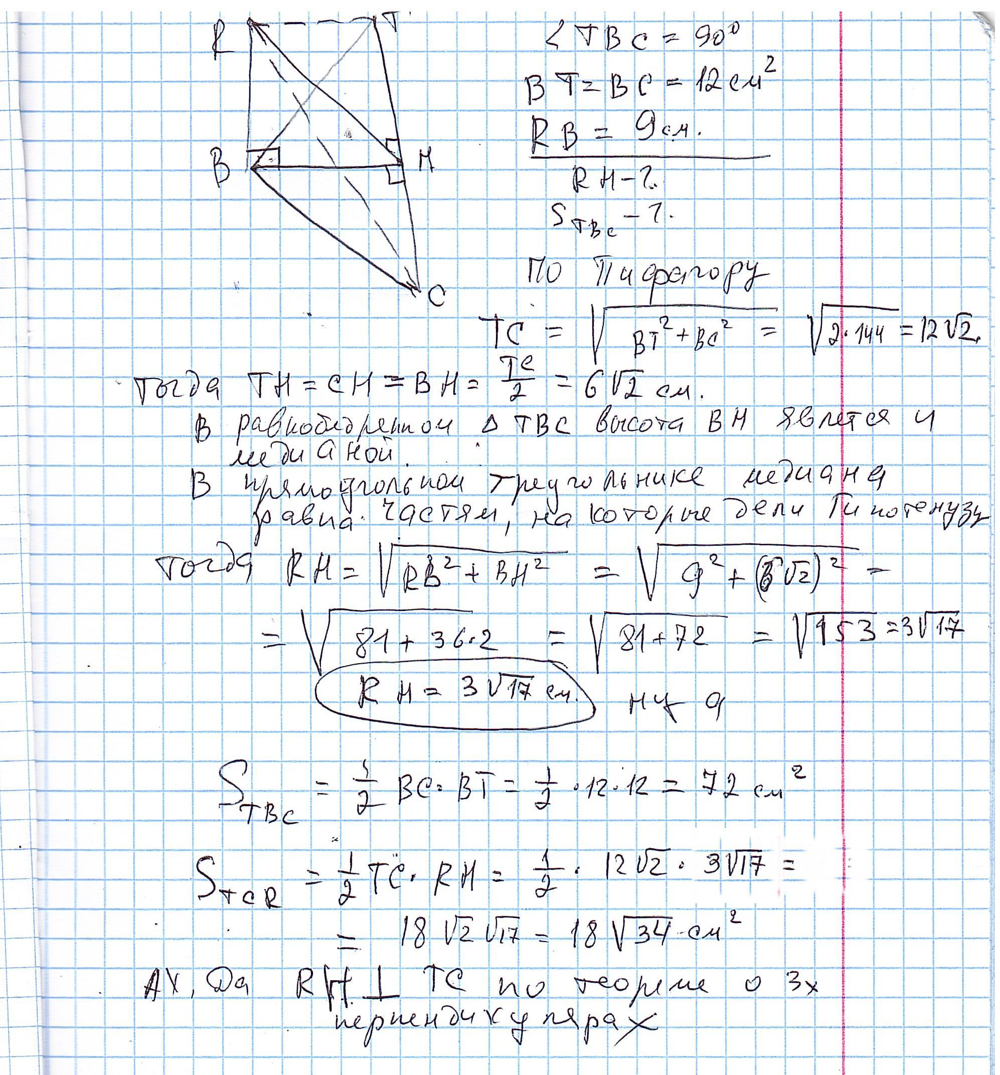 У прямокутному рівнобедреному трикутнику TBC, TB=BC=12^2 см. RB - перпендикуляр, проведений до площини цього трикутника. RB=9см. Знайдіть довжину перпендикуляра, проведённого з точки R до сторони TC. Знайдіть площу трикутника TCR.