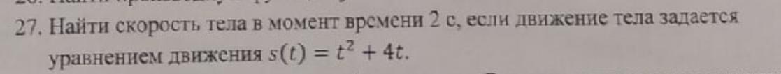 Найти скорость тела в момент времени 2с, если движение тела задается уравнением движения S(t) = t^2 + 4 t