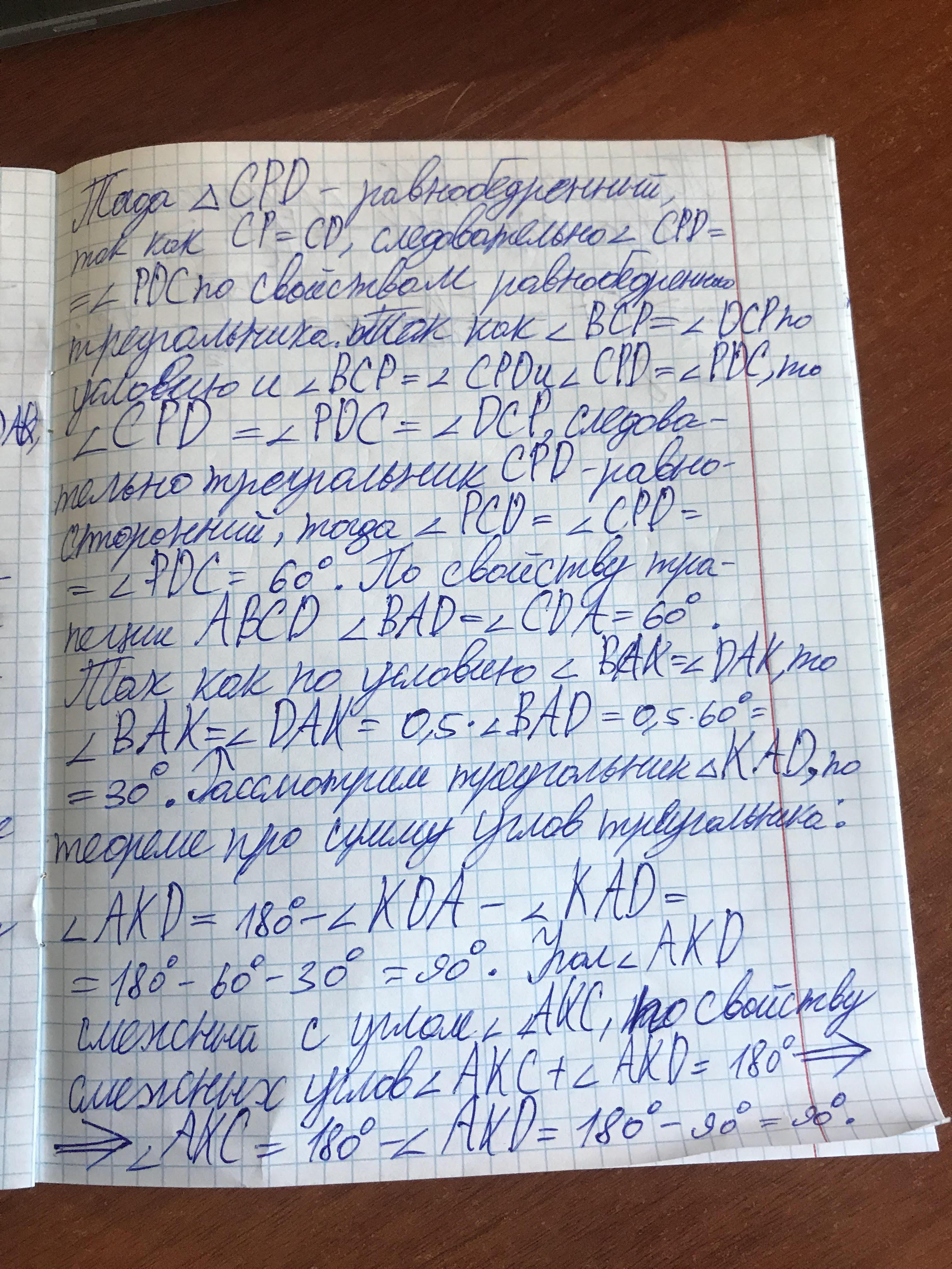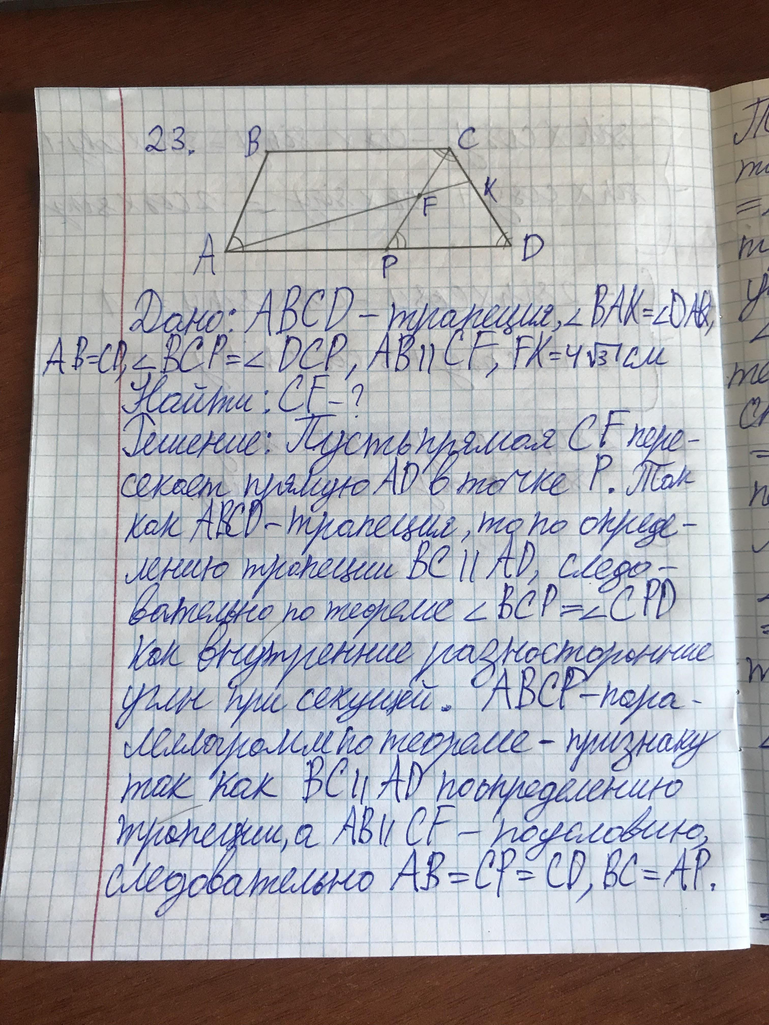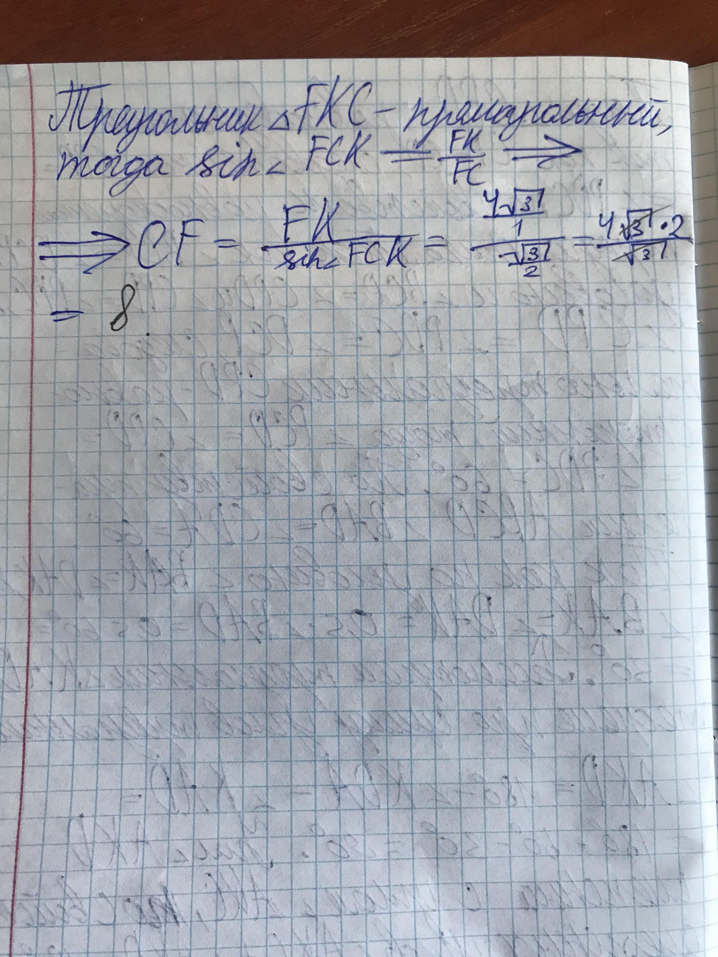 Там треугольник СND равносторонний, DF высота, медиана, биссектриса. Тр. CFD прямоугольный, угол FCK 60°. CF гипотегуза CF =FK/sin60° =4|/3×2:|/3=8