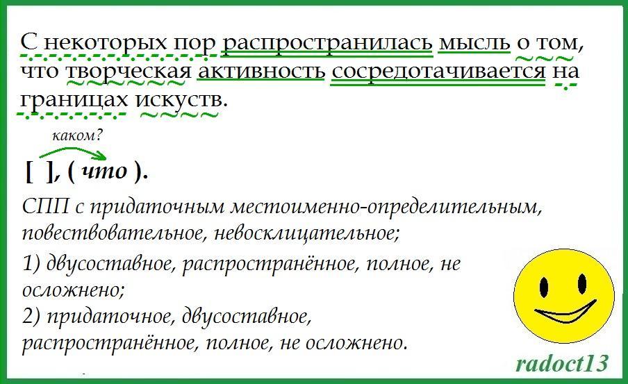 произведите синтаксический разбор предложения с указанием схему предложения: «С некоторых пор распространилась мысль о том что творческая активность сосредотачивается на границах искуств»