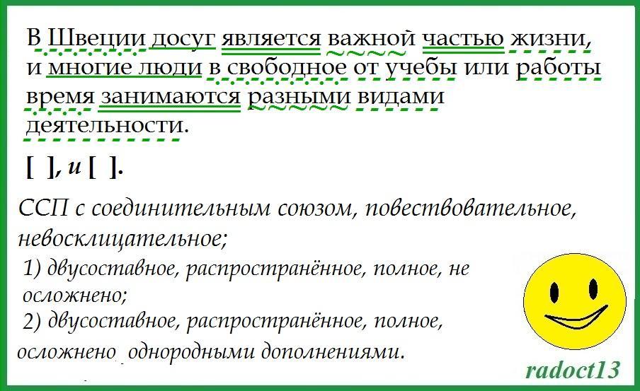 произведите синтаксический разбор предложения, с указанием схемы предложения: «В Швеции досуг является важной частью жизни и многие люди в свободное от учебы или работы время занимаются разными видами деятельности»