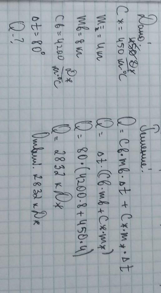 в железный котёл массой 4кг налита вода массой 8 кг. Какое количество теплоты нужно передать котлу с водой для изменения их температуры от 20 до 100 градусов
