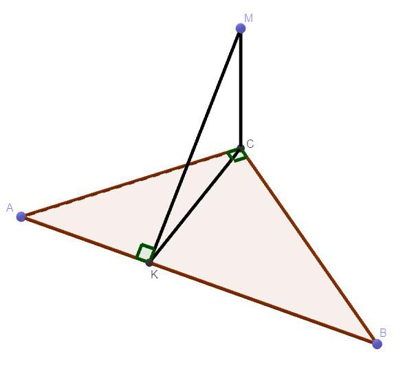 По теореме про три перпендикуляра CK ⊥ AB, так как по условию CM ⊥ ABC, MK ⊥ AB. По формулам площади для треугольника ΔABC: