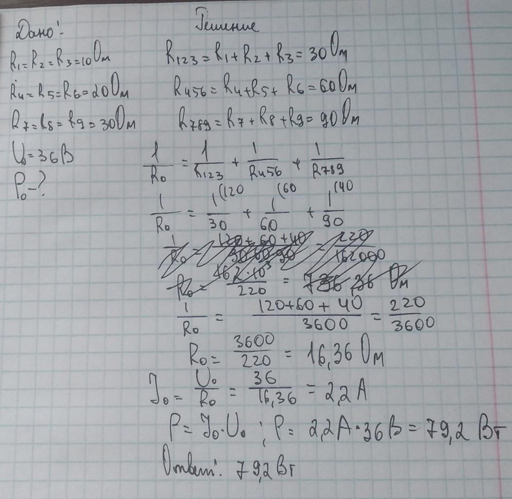 Рассчитать мощность потребляемую цепью состоящую из R1=R2=R3=10 ом, R4=R5=R6=20 ом, R7=R8=R9=30 ом, U=36 B (1 РИС.)