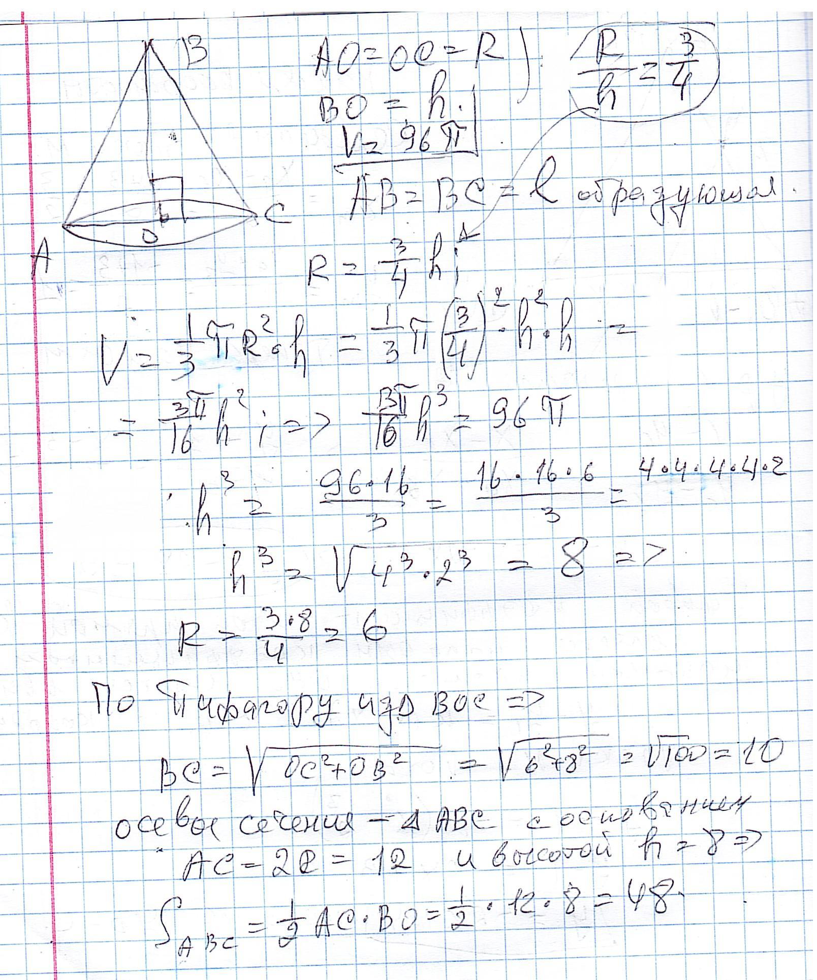 Дан конус. R:H=3:4.Объём конуса равен 96Псм3.Найти а)длину образующей б) площадь осевого сечения