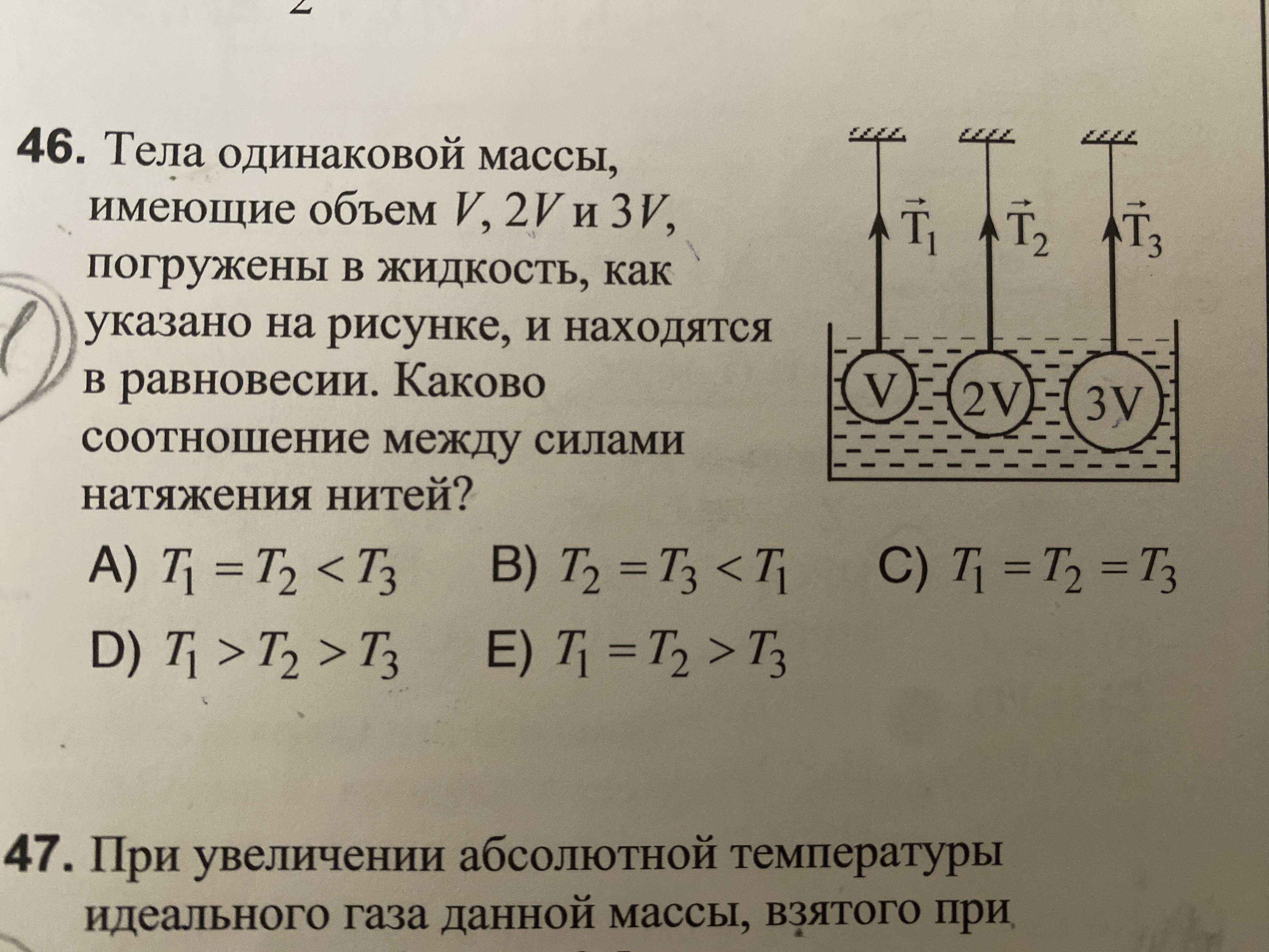 На большее тело действует большая сила Архимеда при одинаковой силе тяжения. Поэтому натяжение нити у большего тела меньше. Ответ: D
