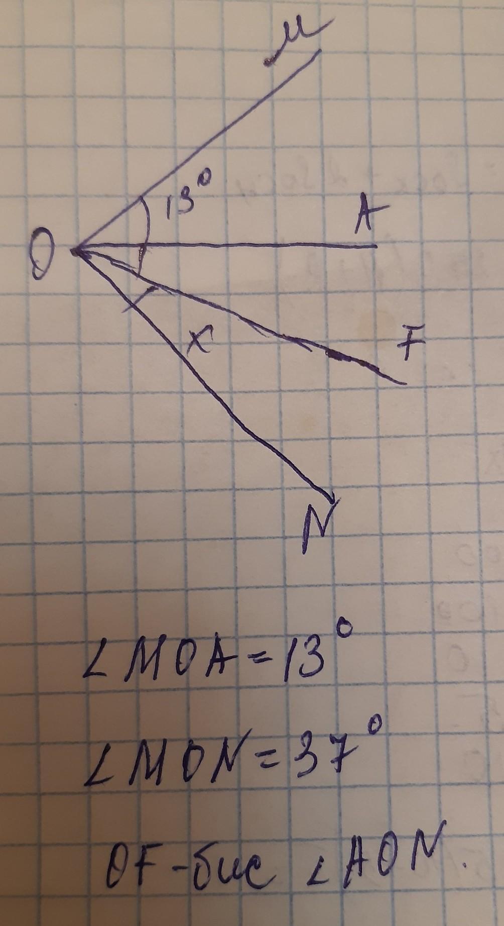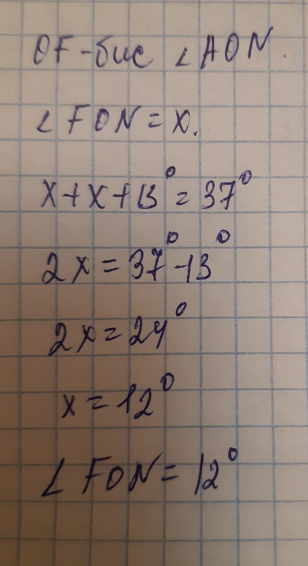 луч ОА делит угол МОN на две части, ОF-биссектриса угла АОN, найди угол FON, если угол MON=37°, угол MOA=13°. Ответ двй в градусах.