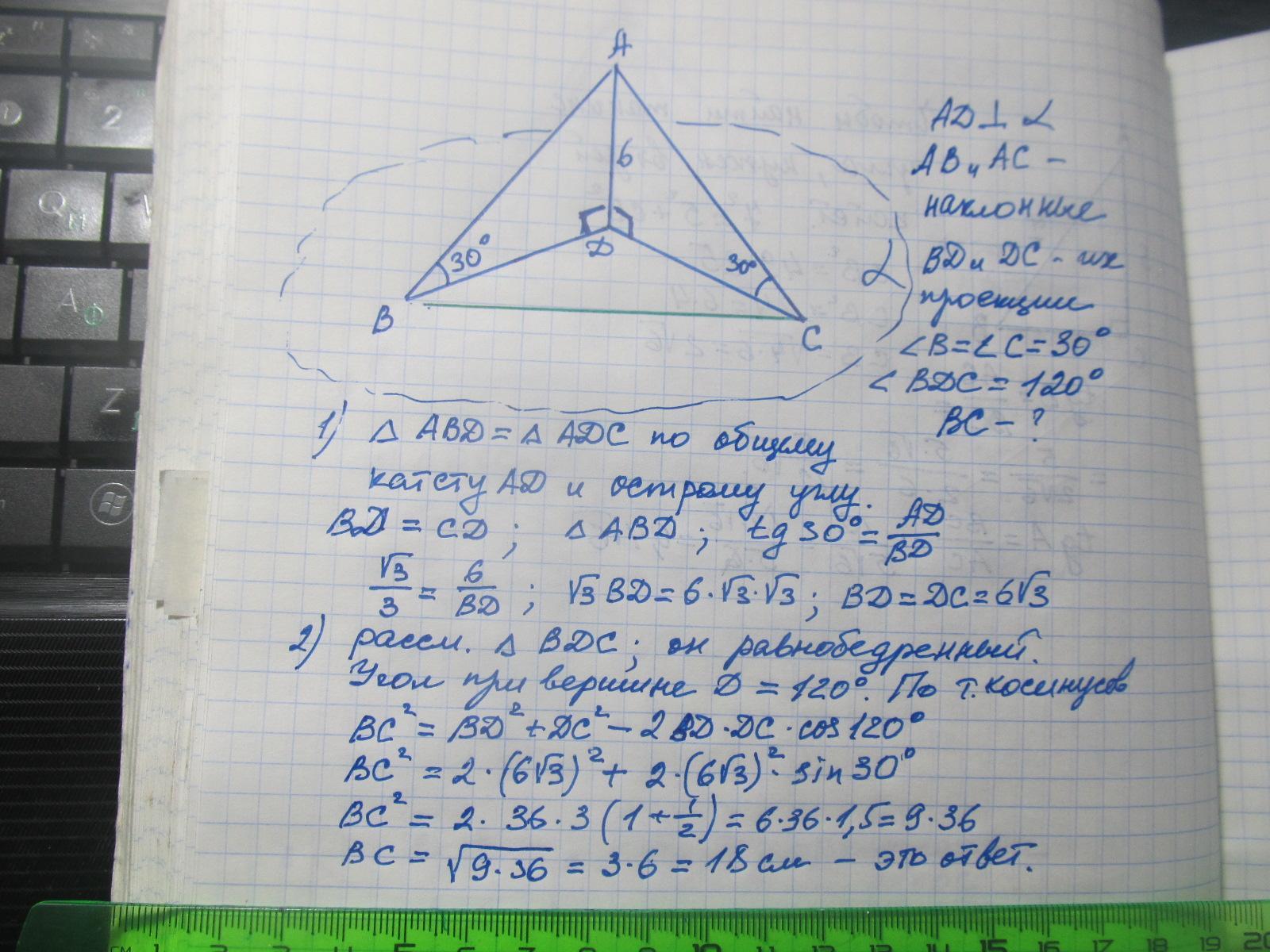 3 точки удаленной от плоскости на расстоянии 6 см, проведены две наклонные которые образуют с плоскостью на 30°. Угол между проекциями наклонных равен 120°. Найти расстояние между основаниями наклонных