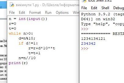Требовалось написать программу, которая получает на вход натуральное число N, не превосходящее 109, и выводит число, которое получается из N после удаления всех единиц; порядок остальных цифр при этом не меняется. Например, число 19520125 должно быть преобразовано в число 952025. Число, в котором все цифры — единицы и нули, должно быть преобразовано в 0. Незначащие нули в старших разрядах полученного числа печатать не нужно.