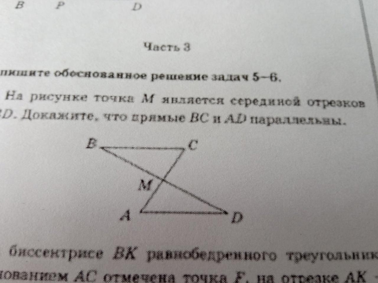 На рисунке точка M является серединой отрезков AC и BD. Докажите, что прямые BC и AD параллельны