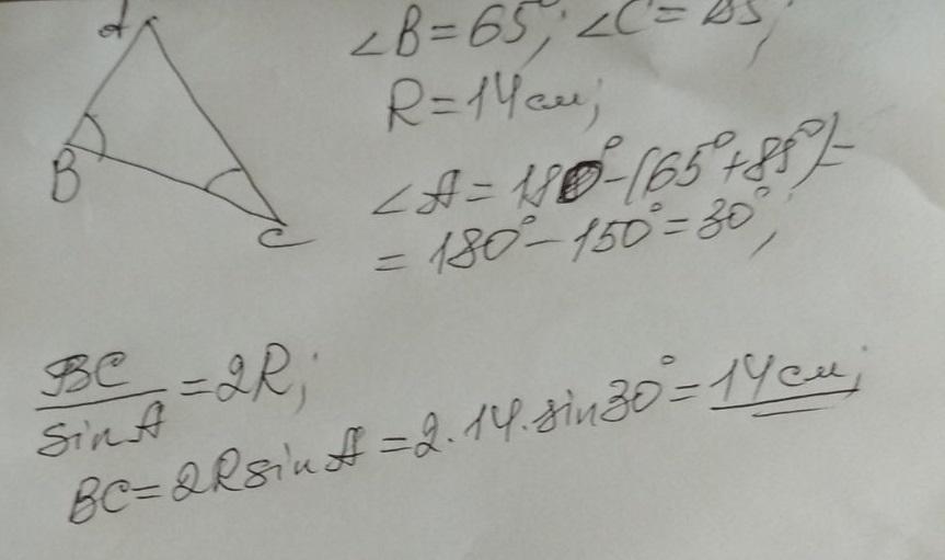 углы B и C треугольника ABCравны соответственно 65° и 85°. Найдите BC, если радиус окружности, описанный около этого треугольника ABC равна 14