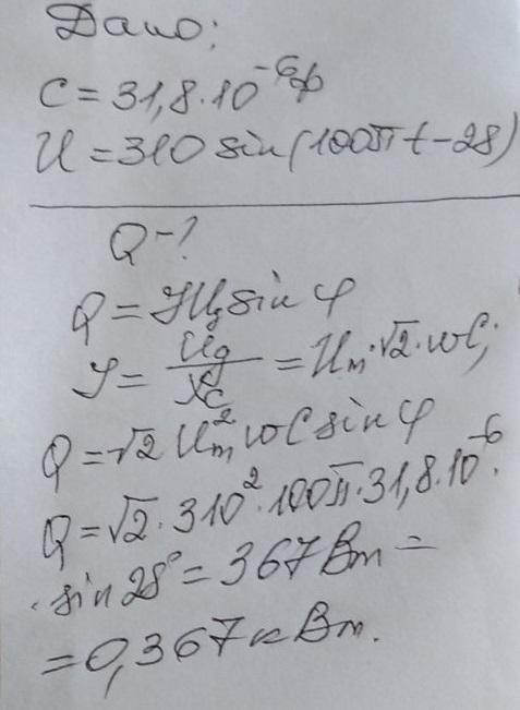 Конденсатор ёмкостью 31,8 мкФ подключена к синусоидальному напряжению u= 310sin(wt-28^0) частотой 50Гц. Вычислить реактивную мощность цепи