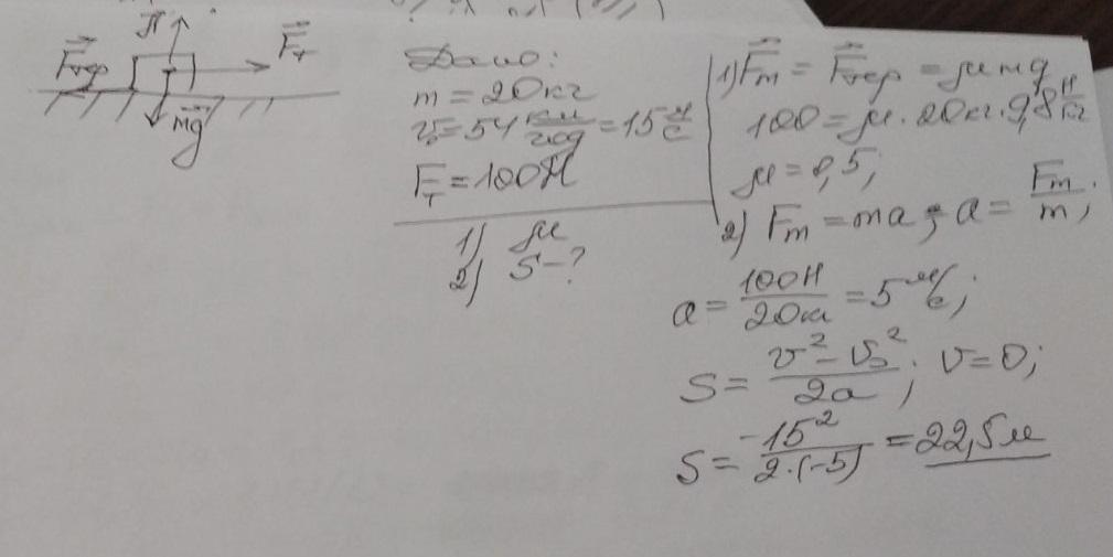 ПОМОГИТЕ ПОЖАЛУЙСТА!!!СРОЧНО И РОСПИШИТЕ!!!!Тіло масою 20 кг тягнуть по горизонтальній поверхні зі швидкістю 54 км/год прикладаючи силу 100H.1)Чому дорінює значення коефіцієнта тертя? 2)Який шлях пройде тіло,якщо сила перестане раптом діяти?