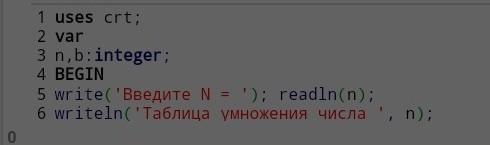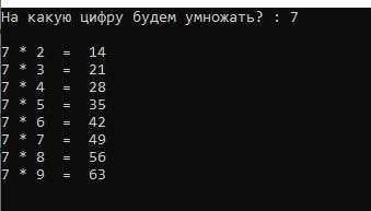2. Написать программу, которая выводит на экран таблицу умножения, например, на 7. Рекомендуемый вид экрана во время работы программы приведен ниже.