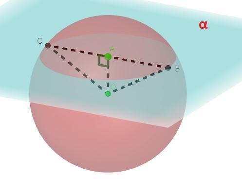 Решение: Сечением шара плоскостью по определению является окружность .Проведем прямую которая пусть пересекает окружность с центром A в точках B и C, тогда отрезок BC по определению диаметр окружности с центром A. Так как по условию OA ⊥ α, то прямая OA перпендикулярна к любой прямой лежащей в плоскости α по следствию из определения перпендикулярности прямой к плоскости, то есть OA ⊥ BC. Так как точки B и C принадлежат шару, то отрезки OB и OC - радиусы шара. Так как точка A центр окружности, то она по свойству центра окружности делит диаметр пополам на два равных радиуса, то есть AC = AB = BC : 2. Рассмотрим прямоугольный(OA ⊥ BC) треугольник ΔAOC. По теореме Пифагора: см.