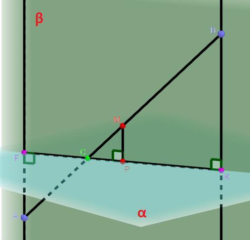 , тогда по следствию из аксиомы через параллельные прямые AF и BK можно провести плоскость, и притом только одну. Через параллельные прямые AF и BK проведем плоскость β. По аксиоме стереометрии плоскости пересекаются по прямой если имеют общую точку. Так как A,B ∈ β и C ∈ AB, то C ∈ β. Так как F, K, C ∈ α и F, K, C ∈ β , а плоскости пересекаются по прямой, то точки F,K,C лежат на одной прямой. Угол ∠FCA = ∠BCK как вертикальные углы, тогда так как AF ⊥ FK и BK ⊥ FK, то ∠AFC = ∠BKF = 90°, следовательно треугольник ΔFCA подобен треугольнику ΔBCK по двум углам, из подобия треугольников следует, что