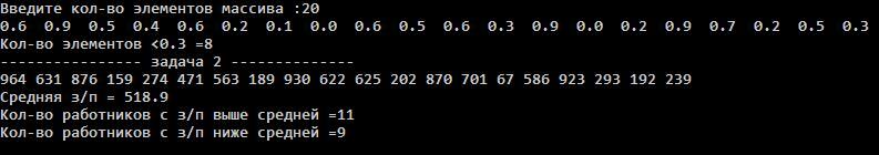 б) в массив произвольного размера внесены суммы месячного за работка в порядке возрастания табельного номера. Найти количество работающих, чья зарплата ниже средней и количество работающих, чья зарплата выше средней.