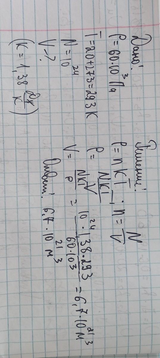 В баллоне под давлением 60 кПа и температуре 20 градусов содержится 10^24 молекул. Определите объем баллона.