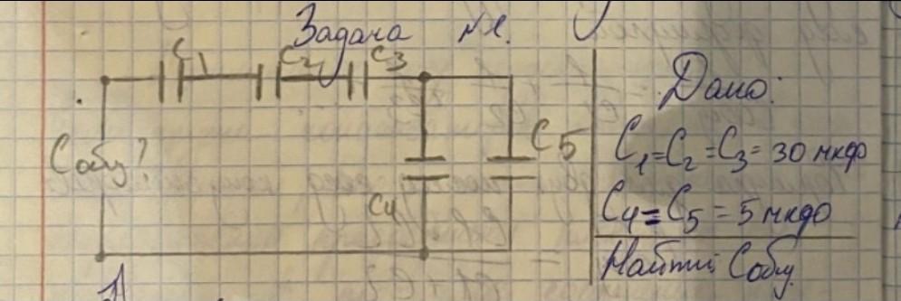 Собщее = с123 / n = 10 / 2 = 5 мкФ (n - количество ветвей с одинаковой емкостью).