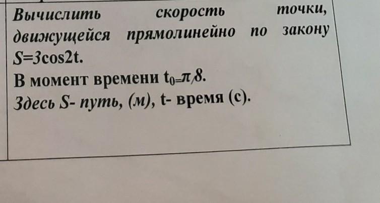 Вычислить скорость точки, движущейся прямолинейно по закону S=3cos2t. В момент времени t0=П(пи)/8. Здесь S- путь, (м), t- время (с). закрыть