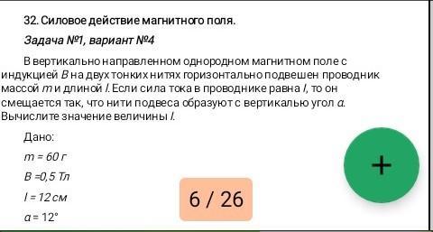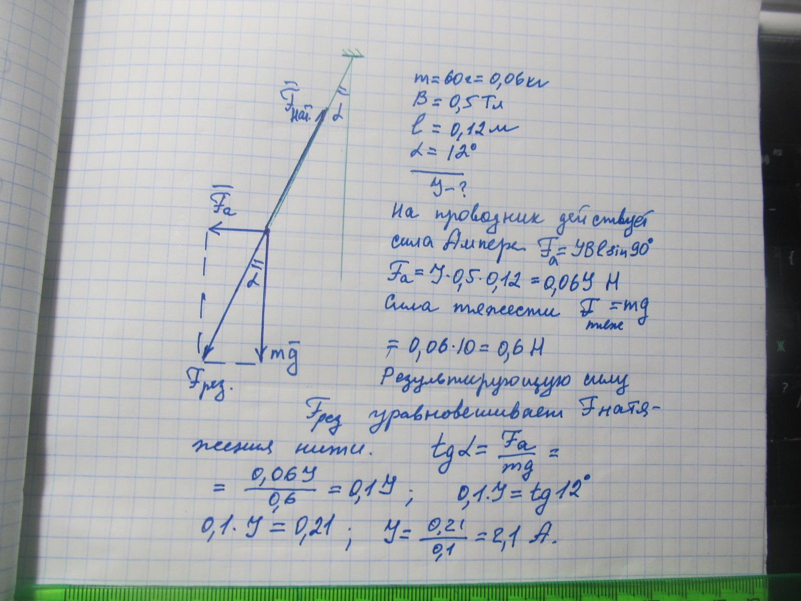 В вертикально направленном однородном магнитном поле с индукцией 0,5Тл на двух тонких нитях горизонтально подвешен проводник массой 60г и длинной 12см..