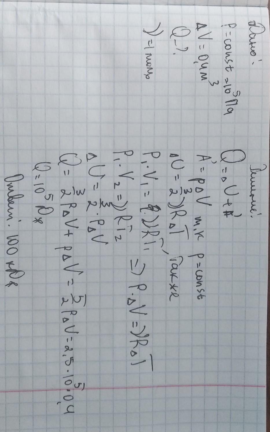 Чему равно количество теплоты, полученное одноатомным идеальным газом при изобарном расширении, если его объем увеличился на 0,4м^3? Давление газа равно 10^5 Па. Ответ дать в кДж.