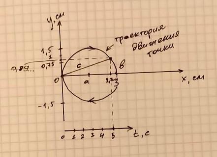Значит, точка находилась в начале системы координат. Очевидно, что при заданных уравнениях координат движение точки раскладывается на колебательное вдоль оси Х и такое же - вдоль оси Y. Полное движение - вращательное. Также очевидно то, что через 5 секунд точка не будет находится на какой-то из осей координатной системы, т.к. Х и Y будут больше нуля. Точка будет над осью Х и справа от оси Y. Следовательно, перемещение мы можем найти по правилу Пифагора - им будет являться гипотенуза прямоугольного треугольника, в котором катетами являются отрезки, отложенные от начала системы координат. Длины отрезков равны значению координат X и Y в момент времени t = 5 c.