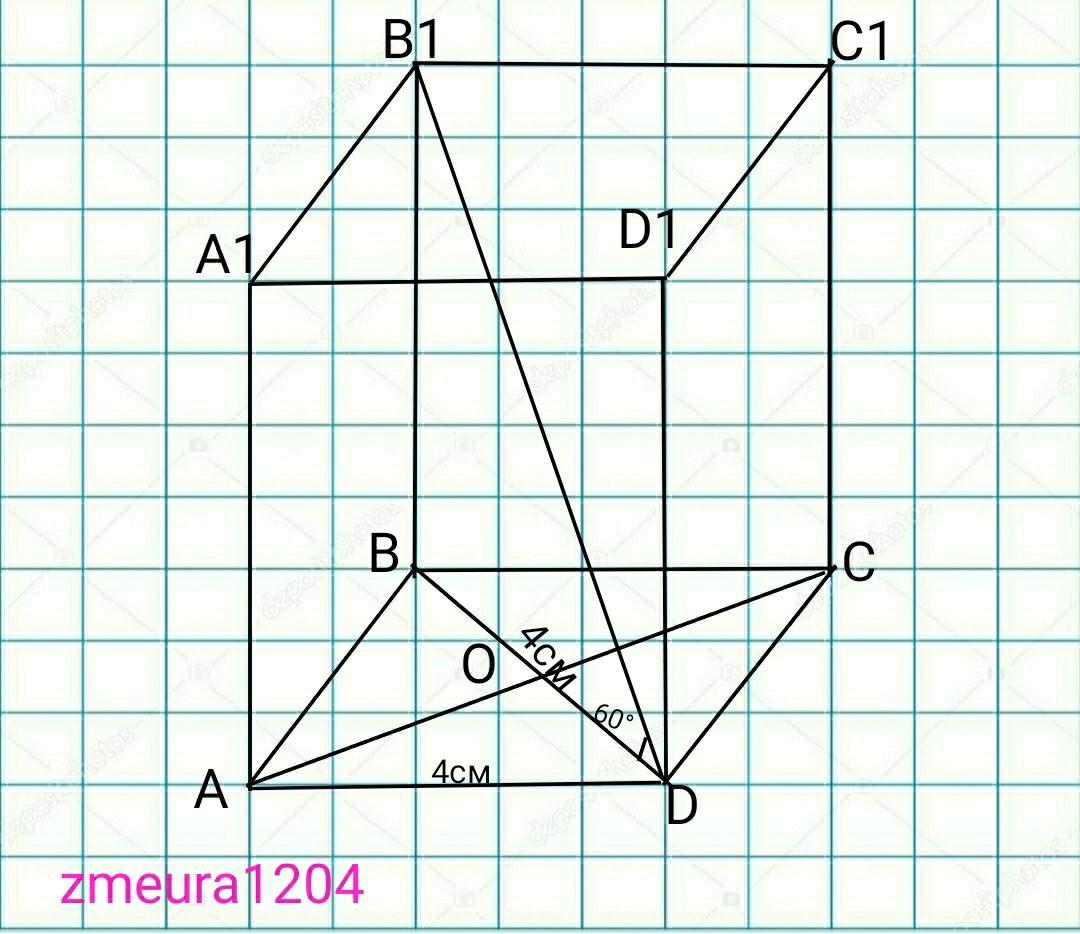 В основании прямого параллелепипеда лежит ромб со стороной 4 см и острым углом 60º. Найти объем параллелепипеда, если его меньшая диагональ образует с плоскостью основания угол 60º.