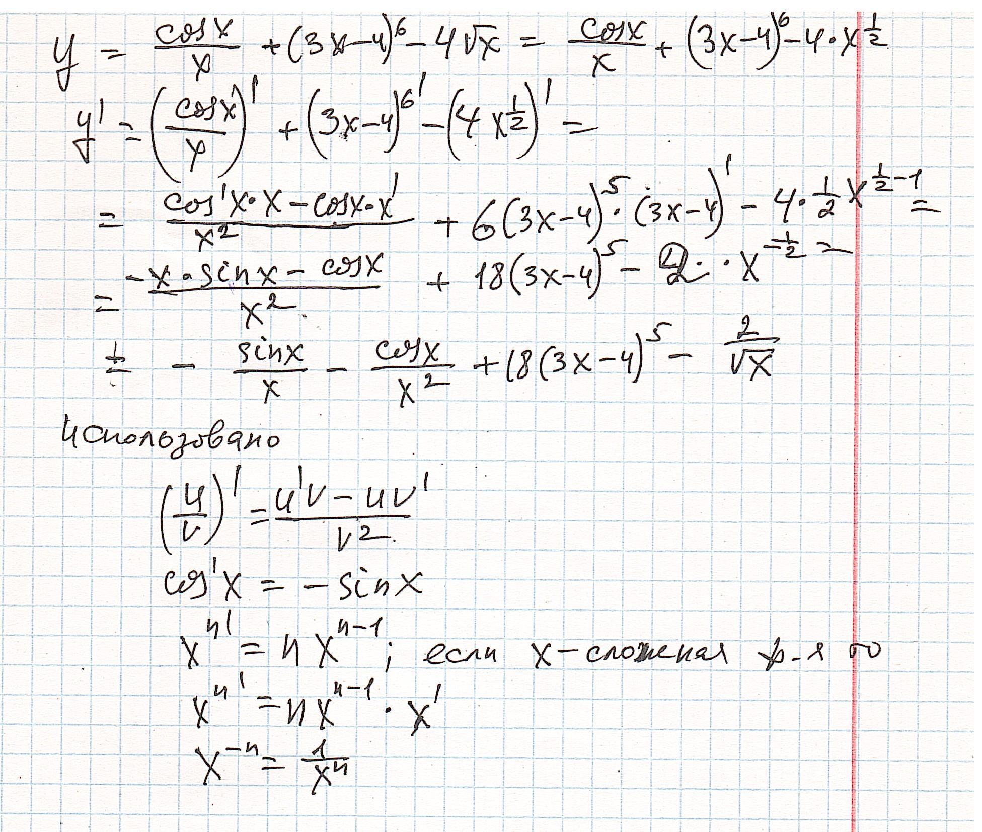 y'=1/x²*(-x*sinx+cosx)+18(3x-4)⁵-2/sqrt(x)