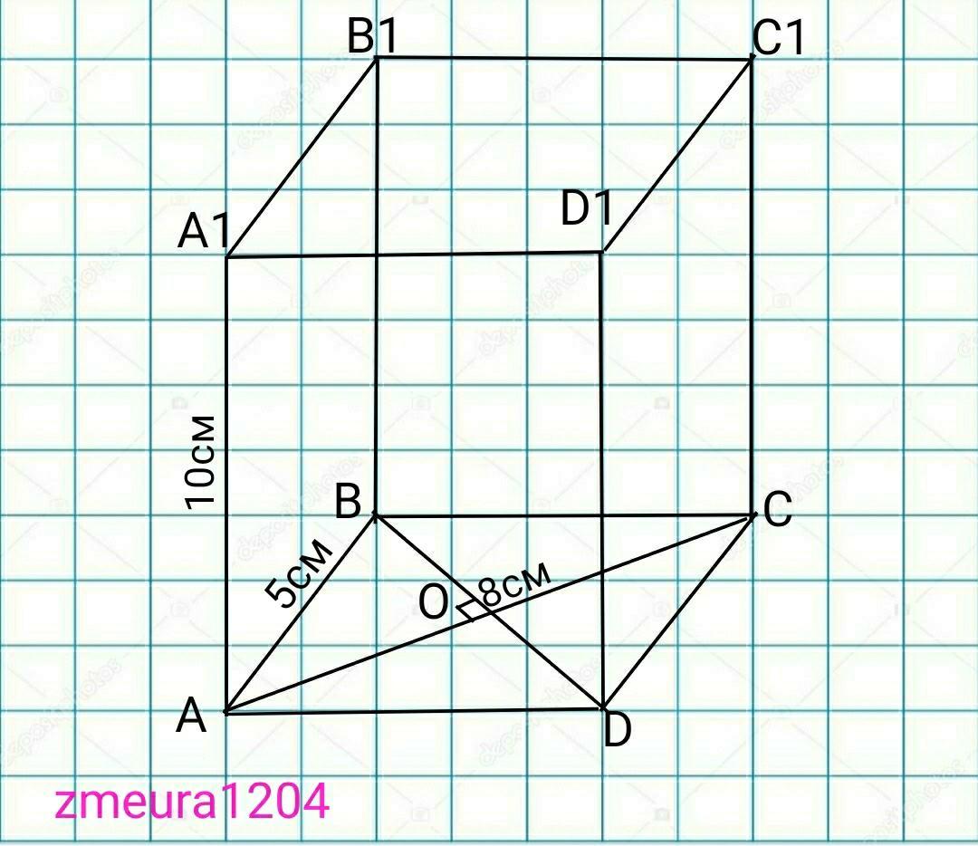 вычислите объём прямой призмы, боковое ребро которой равно 10 см, если в основании призмы лежит ромб со стороной 5 см и диагональ 8 см