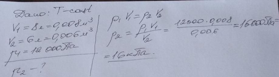 При изотермическом процессе газ сжали от объема 8 л до объема 6 л. Первоначальное давление было 12 кПа. Найти давление после сжатия?
