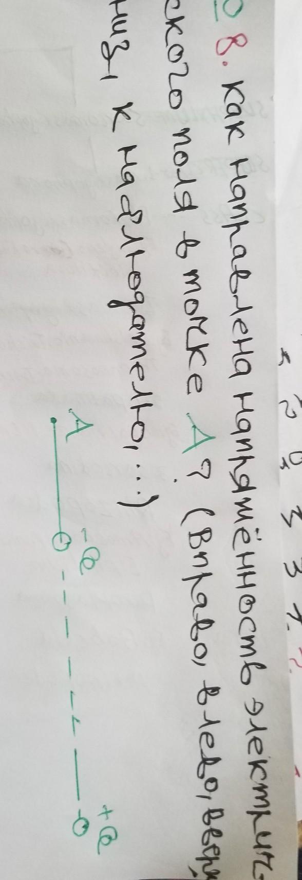 № 8. Как направлена напряжённость электрического поля в точке А? (вправо, влево, вверх, вниз, к наблюдателю,…)